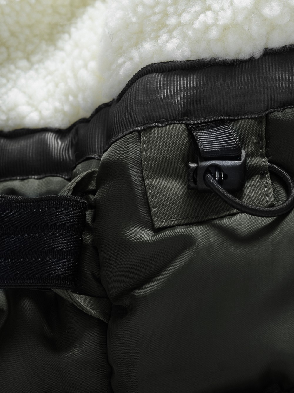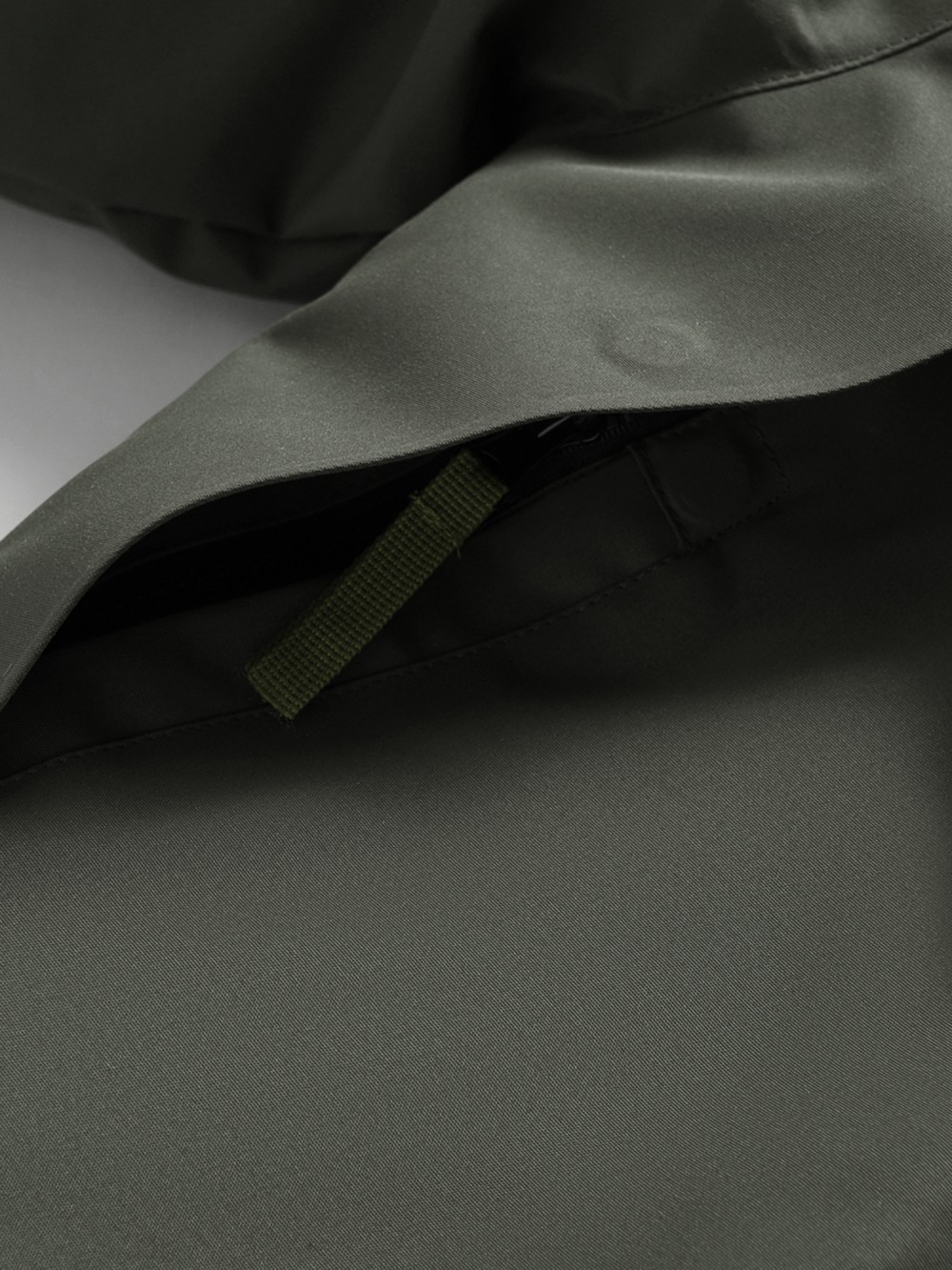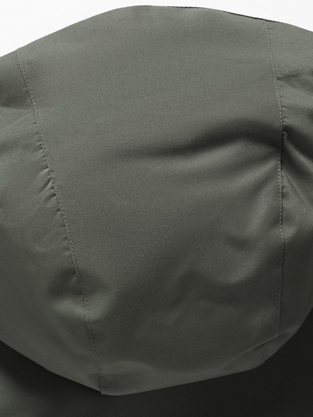 фиксаторы по низу, на капюшоне и по центру (в области талии) позволяют подстроить силуэт и защитить от продувания;